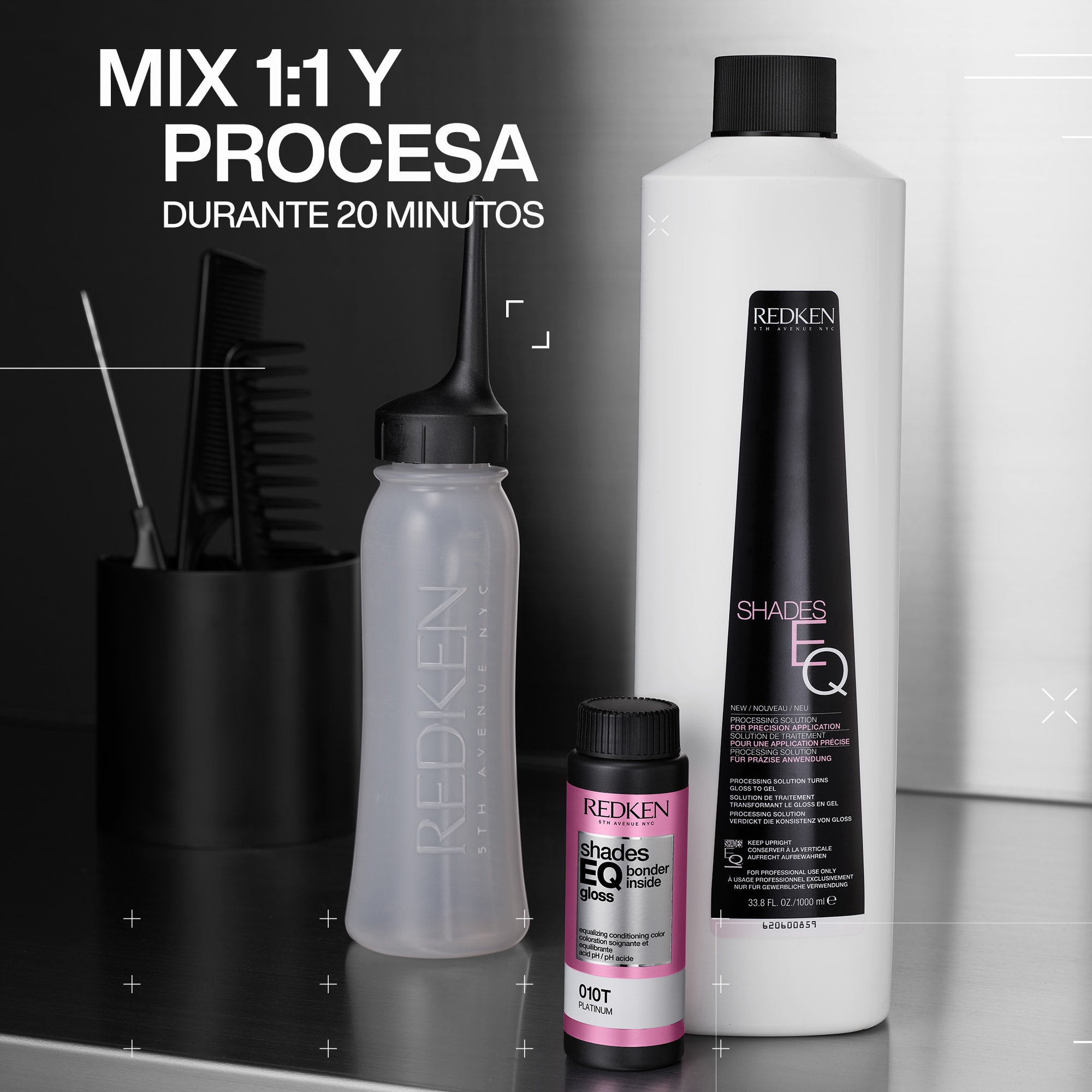 Formular en una proporción de 1:1 con Shades EQ Processing Solution • Shades EQ Gloss se puede aplicar con un tazón y una brocha o una botella y se puede diluir con Crystal Clear para disminuir la intensidad o personalizar cualquier tono • Procese a temperatura ambiente durante 20 minutos